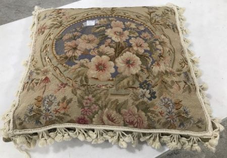 Large Needle Point Floral Throw Pillow, tassel border, good condition, 20". Large Needle Point Floral Throw Pillow, tassel border, good condition, 20".
