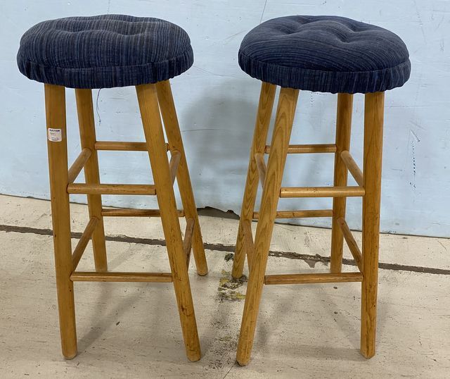 Pair of oak bar stools, upholstered cushions, 30"h. Pair of oak bar stools, upholstered cushions, 30"h.