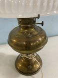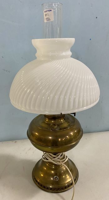 Rayo brass globe oil style lamp, milk glass shade, glass hurricane shade, electrified, 21"h. Rayo brass globe oil style lamp, milk glass shade, glass hurricane shade, electrified, 21"h.