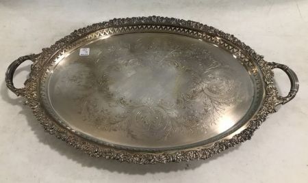 Large Oval Silver Plate Serving Tray, ornate border design, handed, footed, has cleaning wear, 27"w. Large Oval Silver Plate Serving Tray, ornate border design, handed, footed, has cleaning wear, 27"w.