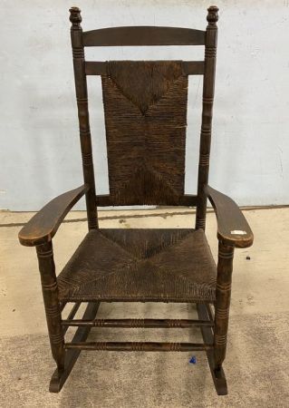 Primitive Style Large Rocker, dark stain, woven seat and back, 46"h. Primitive Style Large Rocker, dark stain, woven seat and back, 46"h.