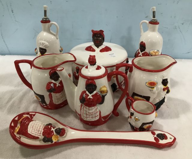 Aunt Jemima Pottery Serving Set, 2 pitchers, 2 tea cups, large wall spoon, dish with cover, 2 oil bottles, good condition. Aunt Jemima Pottery Serving Set, 2 pitchers, 2 tea cups, large wall spoon, dish with cover, 2 oil bottles, good condition.