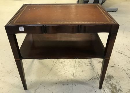 Mahogany two tier side table with leather lining top, dark stain, has some finish wear, 23"h., 25"w., 15"d. Mahogany two tier side table with leather lining top, dark stain, has some finish wear, 23"h., 25"w., 15"d.