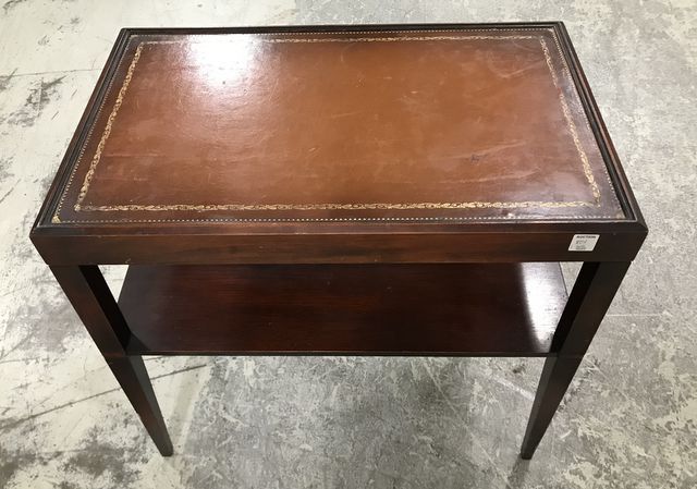 Mahogany two tier side table with leather lining top, dark stain, has some finish wear, 23"h., 25"w., 15"d. Mahogany two tier side table with leather lining top, dark stain, has some finish wear, 23"h., 25"w., 15"d.