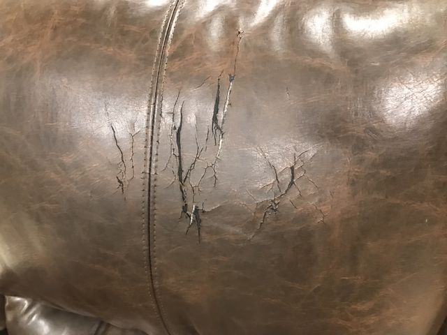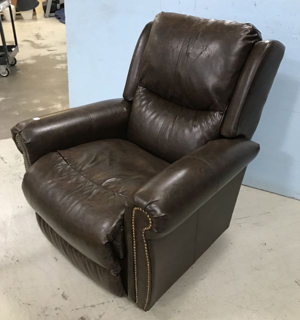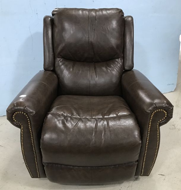 Brown vinyl recliner, tacked border, head rest has cracks. Brown vinyl recliner, tacked border, head rest has cracks.
