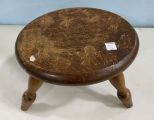 Small vintage pine foot stool, has finish wear, carved animals and words, 8"h., 13"w. Small vintage pine foot stool, has finish wear, carved animals and words, 8"h., 13"w.