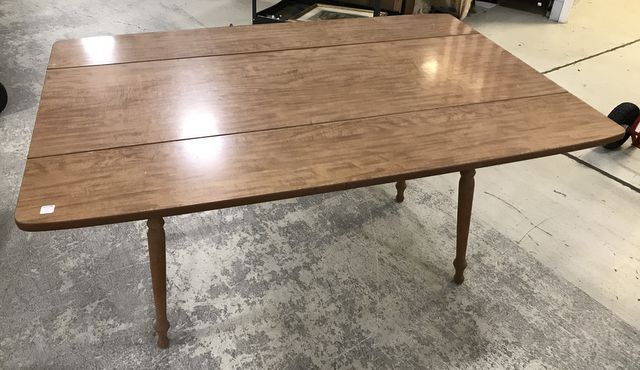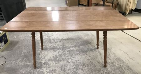 Maple drop leaf breakfast table, wear on border strips, functional, 30"h., 60"long., 40"w. Maple drop leaf breakfast table, wear on border strips, functional, 30"h., 60"long., 40"w.
