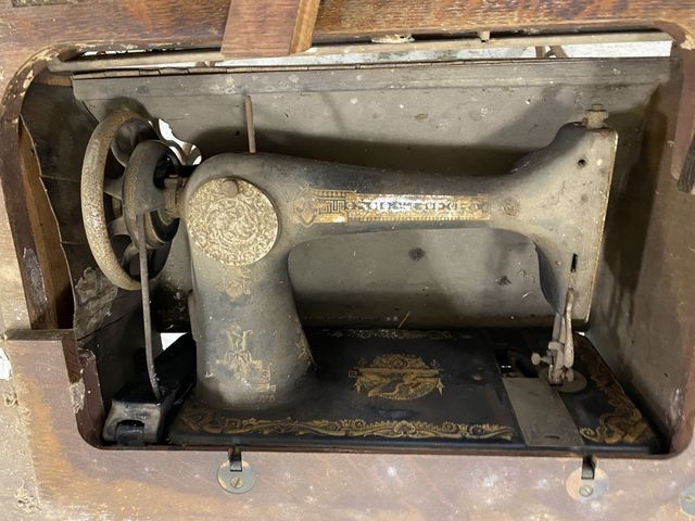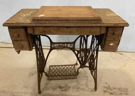 Antique Singer Sewing Machine in Cabinet, iron base, worn cabinet, needs work. Antique Singer Sewing Machine in Cabinet, iron base, worn cabinet, needs work.