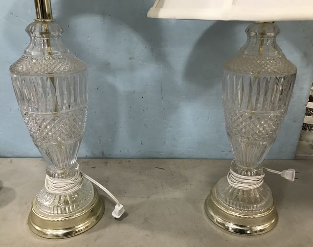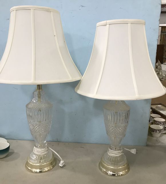 Pair of pressed glass urn lamps, with shades, 29"h Pair of pressed glass urn lamps, with shades, 29"h