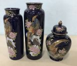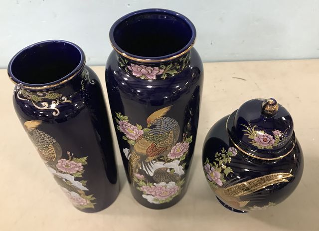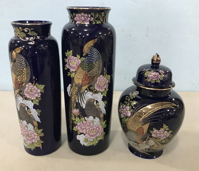 Kutani Japanese Cobalt Porcelain Vases, Gild Pheasant, 10"h., Ginger jar with lid, good condition. Kutani Japanese Cobalt Porcelain Vases, Gild Pheasant, 10"h., Ginger jar with lid, good condition.