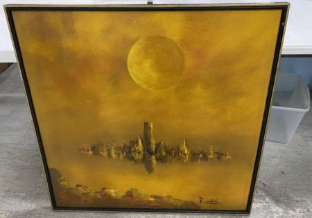 Large Orange City View Painting Signed lower right, on canvas, framed, 37"h., 37"w. Large Orange City View Painting Signed lower right, on canvas, framed, 37"h., 37"w.
