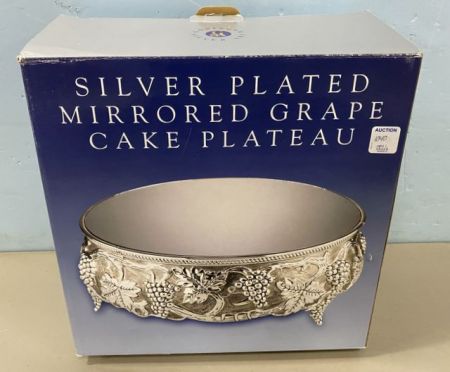 Silver Plated Mirrored Grape Cake Plateau, Goldfinger Company, in box. Silver Plated Mirrored Grape Cake Plateau, Goldfinger Company, in box.