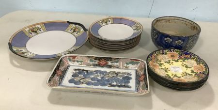 Lusterware Japan charger and plates, blue and white small planter, Andrea dish, Elite porcelain plates. Lusterware Japan charger and plates, blue and white small planter, Andrea dish, Elite porcelain plates.