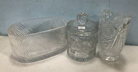 Etched glass biscuit jar, has base chip, large swirl glass planter, pressed glass pitcher. Etched glass biscuit jar, has base chip, large swirl glass planter, pressed glass pitcher.