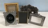 Five assorted styles picture frames, ornate metal designs, inlaid wood framed. Five assorted styles picture frames, ornate metal designs, inlaid wood framed.