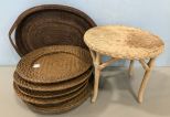 6 Woven Plate Chargers, Serving Tray, and Small Fragile Table, 10"h., 13"dia. 6 Woven Plate Chargers, Serving Tray, and Small Fragile Table, 10"h., 13"dia.