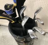 Tour Edge golf set, rescue clubs, irons, and driver. Tour Edge golf set, rescue clubs, irons, and driver.