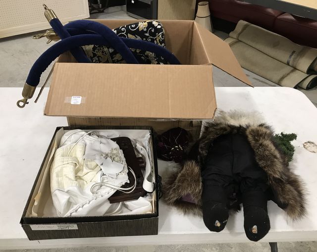 Box Lot of Hand Bags, Pillow, Santa Clause Dolls, and Velvet Divider Ropes Box Lot of Hand Bags, Pillow, Santa Clause Dolls, and Velvet Divider Ropes