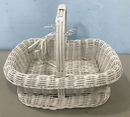 White Wicker Carrying Basket, white painted, with handle, 20"h. White Wicker Carrying Basket, white painted, with handle, 20"h.