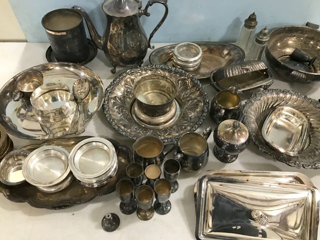 Large Group of Silver Plate Serving Pieces, casserole, pitchers, creamer, sugar, bowls, salt & peppers, small goblets, coasters, butter dish, tops. Large Group of Silver Plate Serving Pieces, casserole, pitchers, creamer, sugar, bowls, salt & peppers, small goblets, coasters, butter dish, tops.
