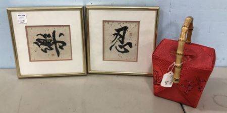 Two Oriental Framed Block Prints "Happiness" & "Tolerance", 9"h., 8"w., include is Oriental red purse. Two Oriental Framed Block Prints "Happiness" & "Tolerance", 9"h., 8"w., include is Oriental red purse.