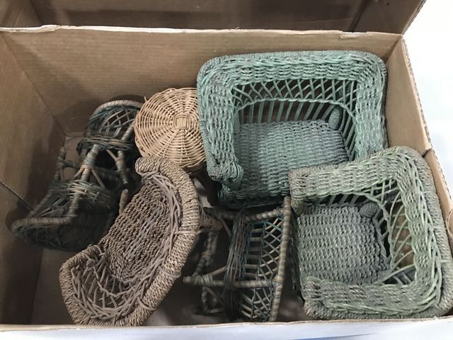 Group of Wicker Doll Furniture, settee, chairs. In a box. Group of Wicker Doll Furniture, settee, chairs. In a box.