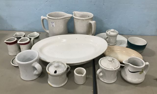 Lot of Vintage Stoneware Potter Pieces, platters, pitchers, sugars, creamers, cups. Lot of Vintage Stoneware Potter Pieces, platters, pitchers, sugars, creamers, cups.