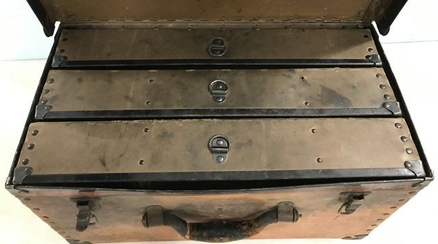 Vintage metal carrying case with three storage drawers, has wear, 10"h., 19"w. Vintage metal carrying case with three storage drawers, has wear, 10"h., 19"w.