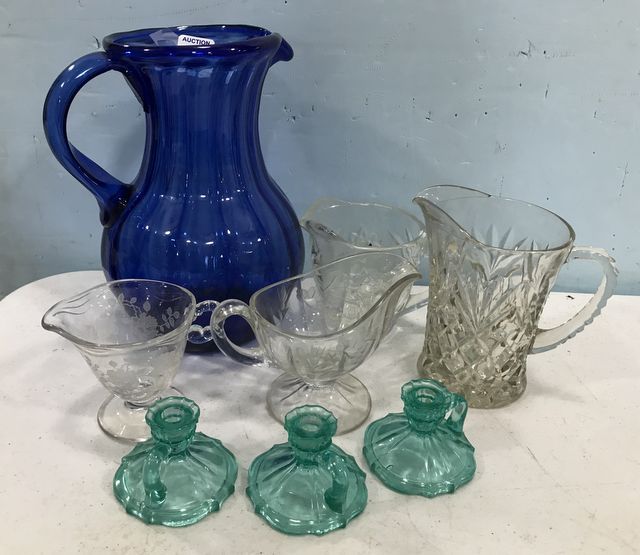 1313 Clear Glass Pitcher, Blue Glass Water Pitcher, and Small Blue Candle Sticks