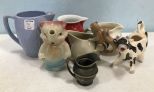 Cow, Squirrel, Pig, and three pottery pitcher, silver plate mini pitcher. Cow, Squirrel, Pig, and three pottery pitcher, silver plate mini pitcher.