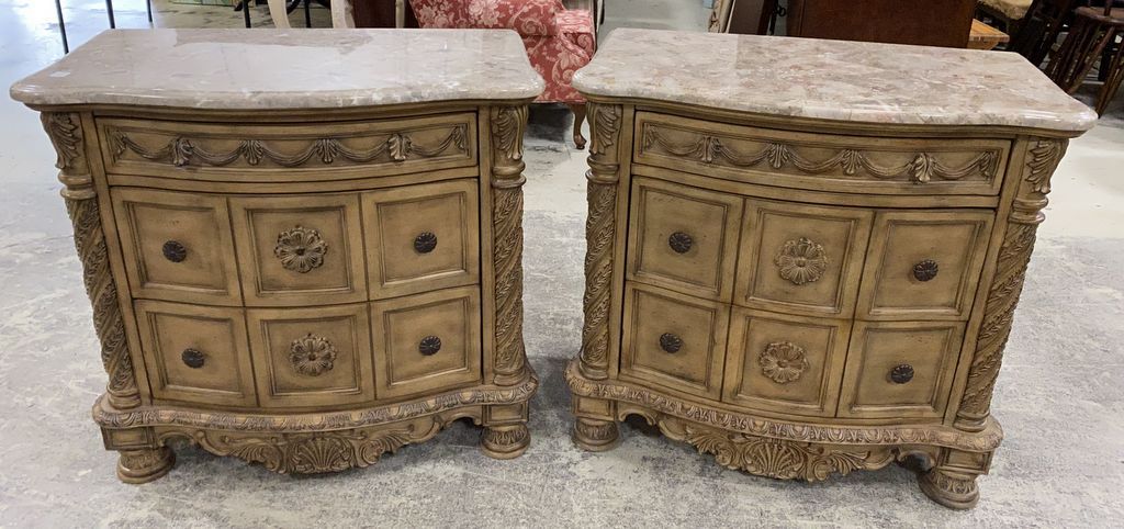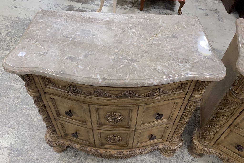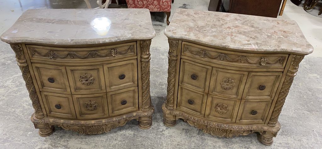 Pair of Millennium by Ashley Night Stands, faux marble top, three drawers, good condition, 33"h., 36"w., 19"d Location 5th Row Pair of Millennium by Ashley Night Stands, faux marble top, three drawers, good condition, 33"h., 36"w., 19"d Location 5th Row