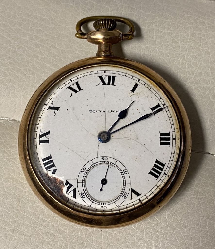 South Bend 20 yrs Open Face Pocket Watch, 9 j, clean movement, needs balance, has chip on face and cracks, Panama, South Bend 20 yrs Open Face Pocket Watch, 9 j, clean movement, needs balance, has chip on face and cracks, Panama,
