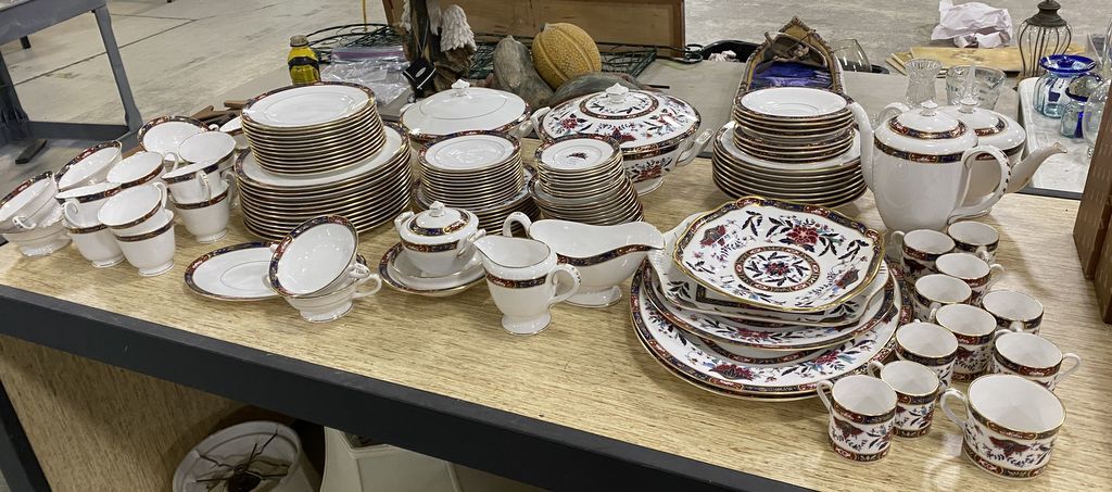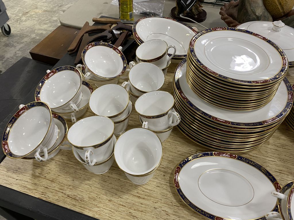 Royal Worchester Prince Regent China Set, platters, dinner plates, salad plates, dessert plates, saucers, cups, gravy, tureens, creamer, sugar, soup bowls and cups, good condition. Royal Worchester Prince Regent China Set, platters, dinner plates, salad plates, dessert plates, saucers, cups, gravy, tureens, creamer, sugar, soup bowls and cups, good condition.