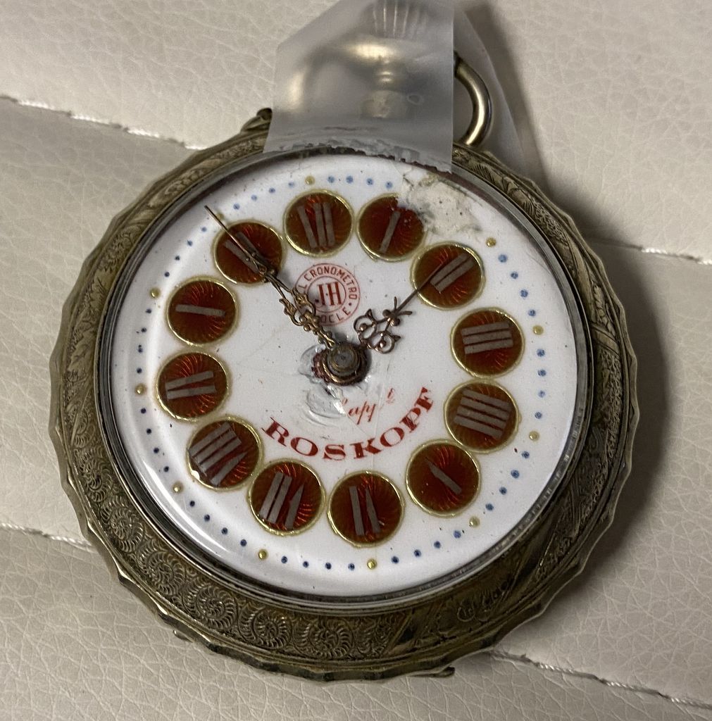 J H Locke Tell Cronometro Size 18 Open Face Pocket Watch, ROSKOPE, dial appears to be silver, crown come of stem, needs work. J H Locke Tell Cronometro Size 18 Open Face Pocket Watch, ROSKOPE, dial appears to be silver, crown come of stem, needs work.