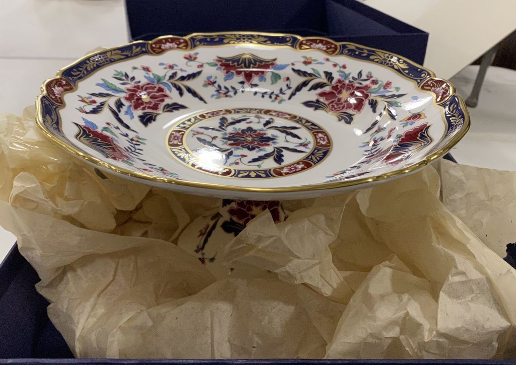 Royal Worchester Prince Regent Tall Comport, in box. Location Left Back Metal Wall Shelves Royal Worchester Prince Regent Tall Comport, in box. Location Left Back Metal Wall Shelves