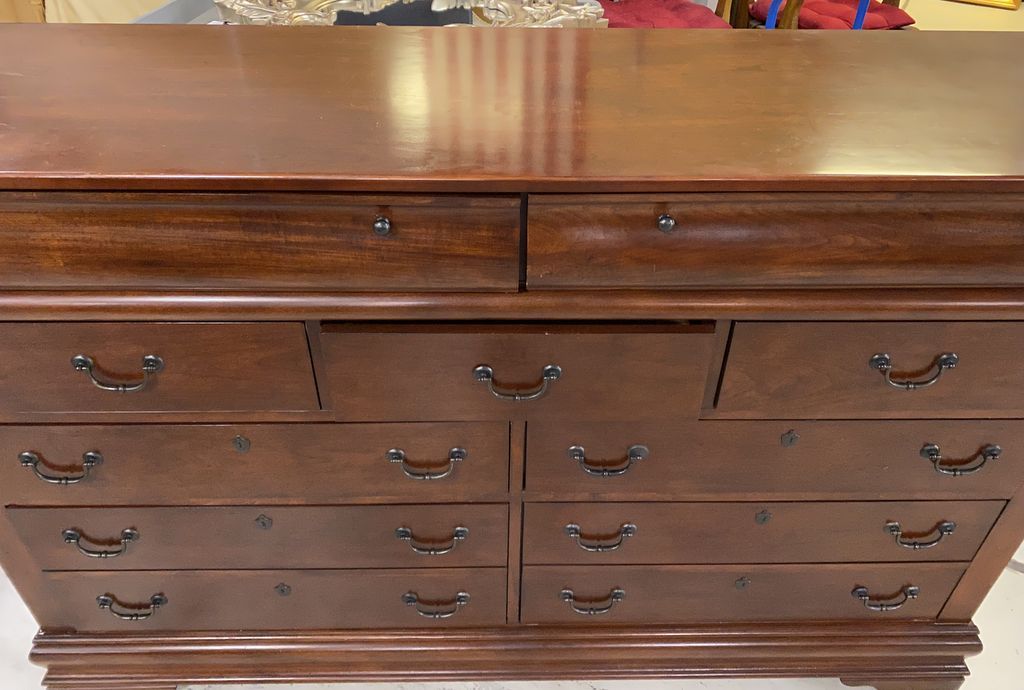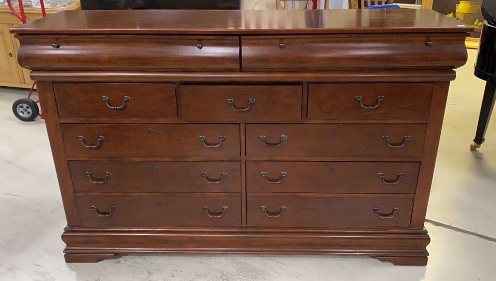 Magnolia Classic Orleans Furniture Large Cherry Dresser, has light finish wear, includes mirror, 44"h., 68"w., 18"d. Location 4th Row Magnolia Classic Orleans Furniture Large Cherry Dresser, has light finish wear, includes mirror, 44"h., 68"w., 18"d. Location 4th Row