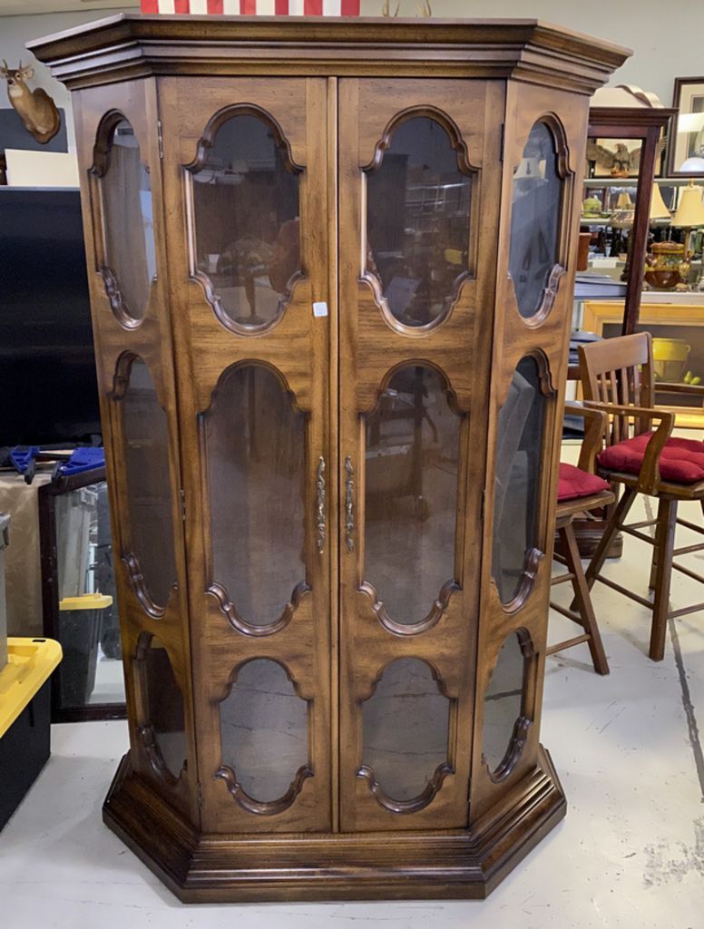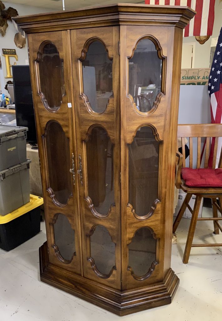 Oak Finish Large Curio Cabinet, double door, glass shelves, lighted, 73"h., 48"w., 13"d. Location 5th Row Oak Finish Large Curio Cabinet, double door, glass shelves, lighted, 73"h., 48"w., 13"d. Location 5th Row