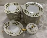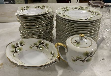 Narumi "Shasta Pine" China, 24 salad plates, some with small chips, 19 dinner plates, pitcher two vegetable bowls, Location Left Back Metal Wall Shelves Narumi "Shasta Pine" China, 24 salad plates, some with small chips, 19 dinner plates, pitcher two vegetable bowls, Location Left Back Metal Wall Shelves