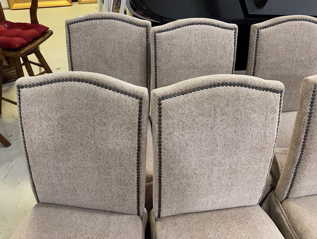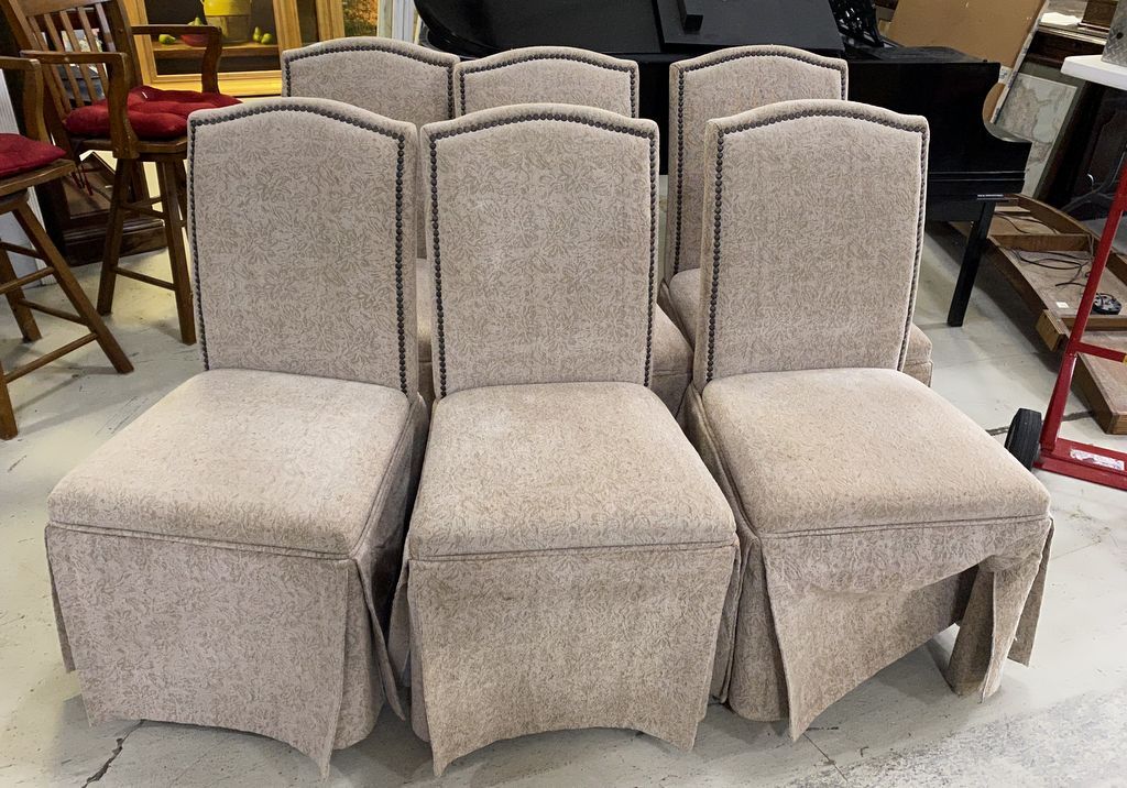Six Parson Chair Beige Skirted Chairs, light wear, good condition, Ashley Furniture. Location 5th Row Six Parson Chair Beige Skirted Chairs, light wear, good condition, Ashley Furniture. Location 5th Row