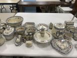 Magnolia Ridge Stoneware Pottery, chargers, serving bowl, butter dish, pitchers, napkins, salt & Pepper shakers, heart dish. some chips. Magnolia Ridge Stoneware Pottery, chargers, serving bowl, butter dish, pitchers, napkins, salt & Pepper shakers, heart dish. some chips.