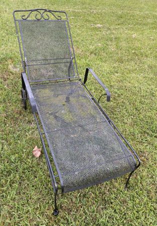 Black Wrought Iron Lounger, on wheels, weathered wear Black Wrought Iron Lounger, on wheels, weathered wear