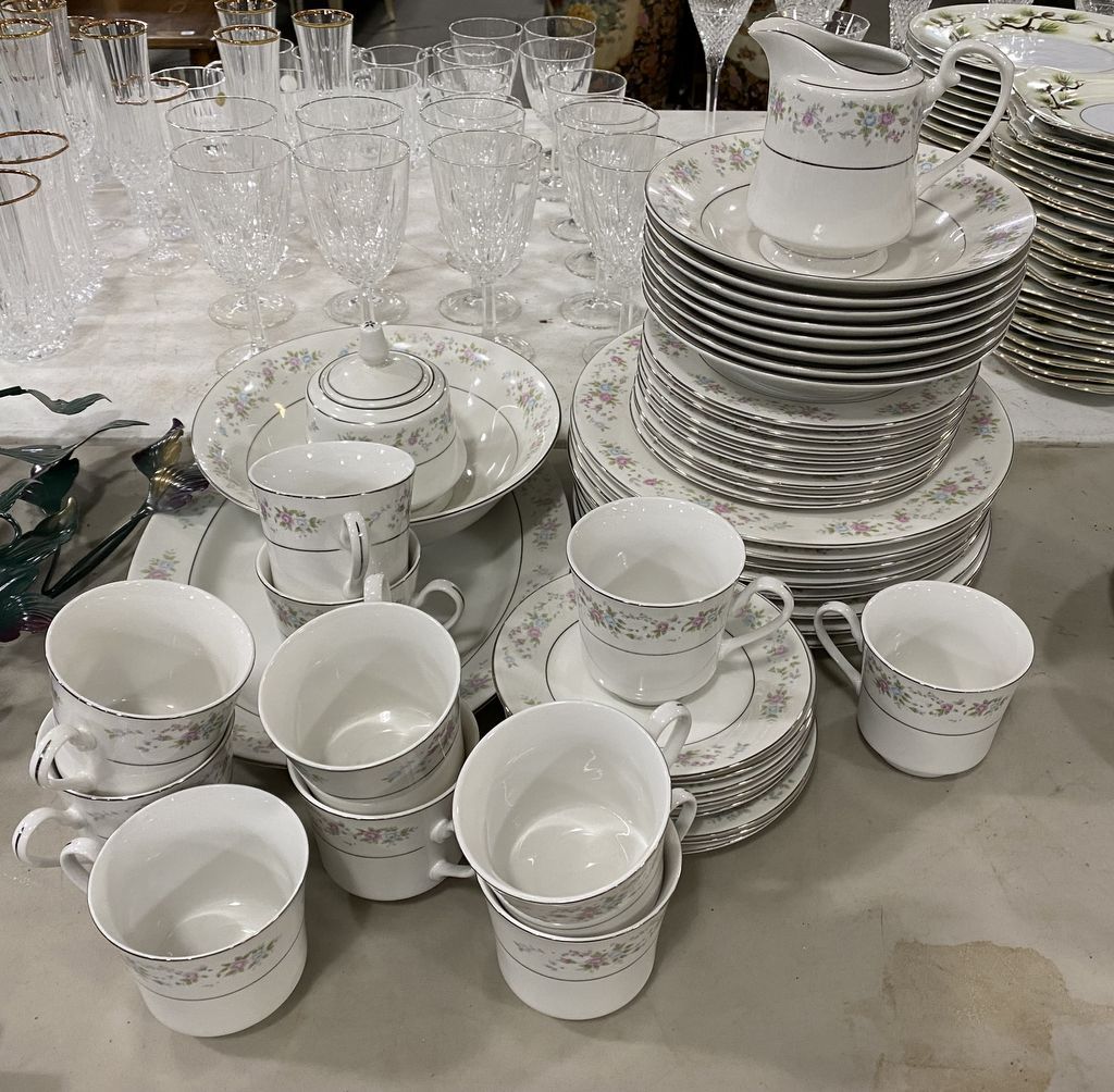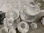 Royal Majestic Cannes China Set, dinner plates, salads, bowls, platter, cups, dessert plates. Location Left Back Metal Wall Shelves Royal Majestic Cannes China Set, dinner plates, salads, bowls, platter, cups, dessert plates. Location Left Back Metal Wall Shelves