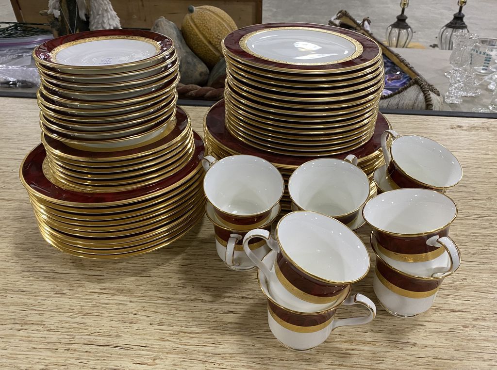 Noritake "Hemingway" Japan China Set, dinner plates, salad plates, saucers, cups, dessert plates, Location Left Back Metal Wall Shelves Noritake "Hemingway" Japan China Set, dinner plates, salad plates, saucers, cups, dessert plates, Location Left Back Metal Wall Shelves