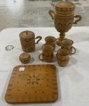 Set of Carved Wooden Pieces. 11"h. Location Right Metal Racks Set of Carved Wooden Pieces. 11"h. Location Right Metal Racks
