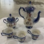 508 Tea Set. Floral Porcelain Teapot, Covered Sugar Bowl, 3 Tea Cups