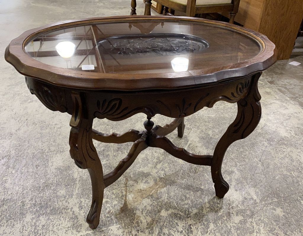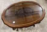 Depression Era Serving Tray Table, glass top tray, walnut, 20"h., 29"w. Location 5th Row Depression Era Serving Tray Table, glass top tray, walnut, 20"h., 29"w. Location 5th Row
