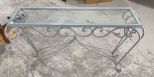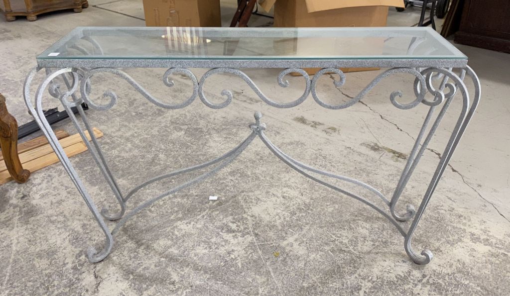 Painted metal foyer wall table, glass top, 32"h., 48"w. Location Left Office Painted metal foyer wall table, glass top, 32"h., 48"w. Location Left Office
