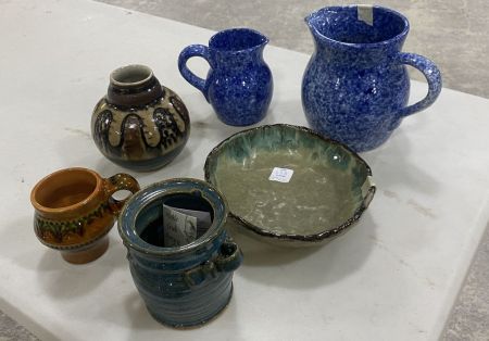 Group of Pottery Includes Handcrafted Stoneware, Hinkle Creek, and Other Misc Pieces. Location Right Metal Racks Group of Pottery Includes Handcrafted Stoneware, Hinkle Creek, and Other Misc Pieces. Location Right Metal Racks