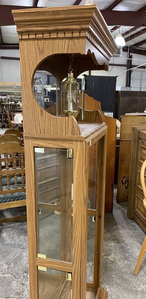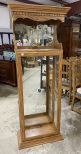 Oak Glass Curio Cabinet, glass shelves, lighted with mirror back, door missing glass, 76"h., 25"w., 12"d. Location 6th Row Oak Glass Curio Cabinet, glass shelves, lighted with mirror back, door missing glass, 76"h., 25"w., 12"d. Location 6th Row