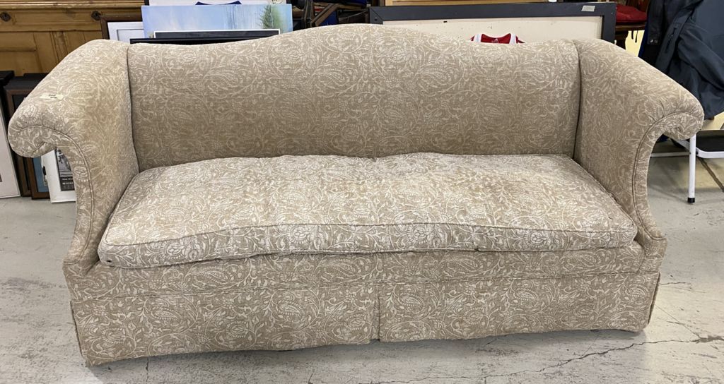 Single Cushion Sofa, floral pattern, good condition, 7' long. Location 1st Row Single Cushion Sofa, floral pattern, good condition, 7' long. Location 1st Row